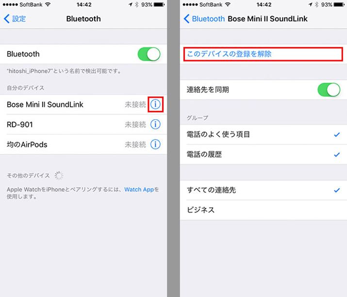 iPhoneは、機器名の右にある「i」ボタンをタップし、「このデバイスの登録を解除」をタップすると切断できる