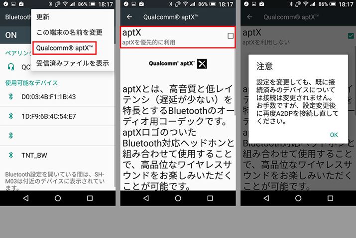 apt-X対応のイヤホンをペアリングすると、「aptXは利用可能です」と表示される