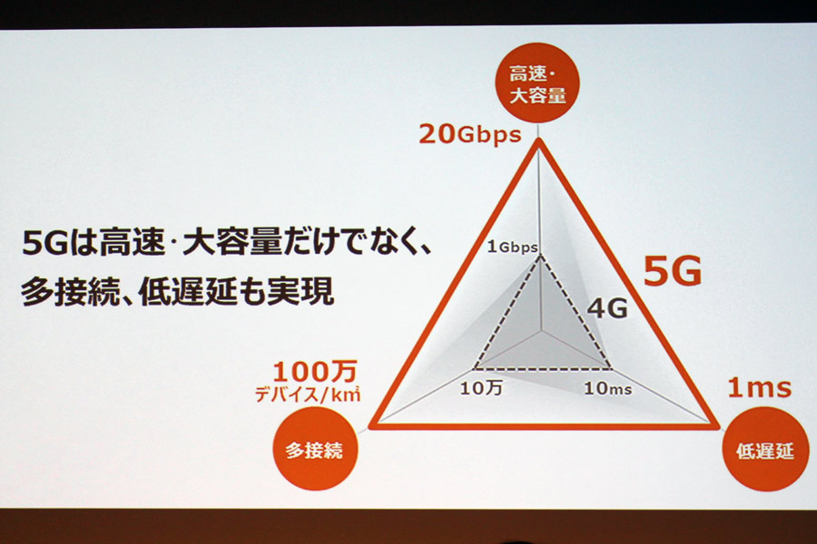 5Gネットワークでは、高速・大容量、多接続、低遅延という3つのポイントで、いずれも4Gと比べて10倍以上の性能アップを目指している。多様なニーズに柔軟に対応できるネットワークを目指している