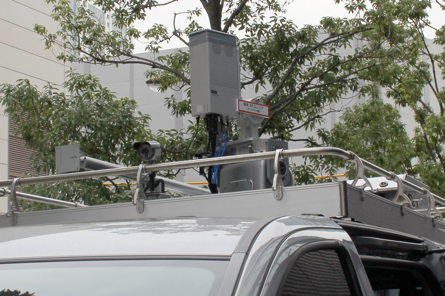 こちらはスマホに該当する端末側のアンテナ。現在のところワンボックスカーの荷室いっぱいに機材が満載されている