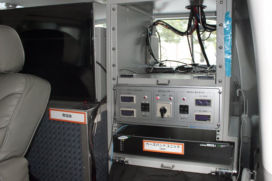 車に積まれた機材はモデムに当たる部分。その隣にあるのは電源で、現在のところ1000W以上の大電力だそうだ。もちろん、実用化の際にはこれが大幅に省電力化される