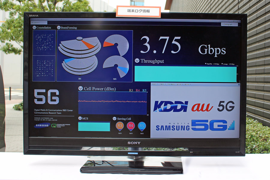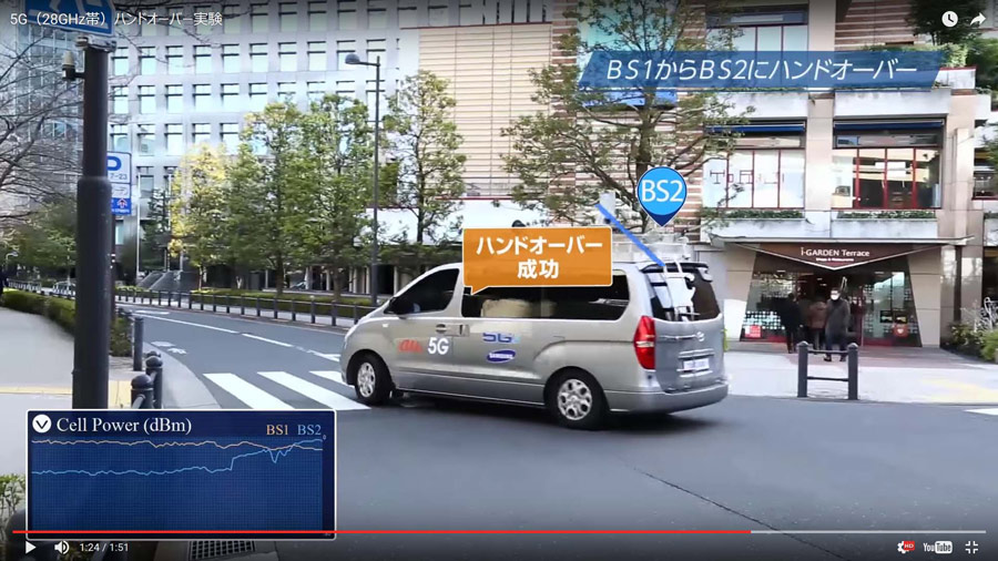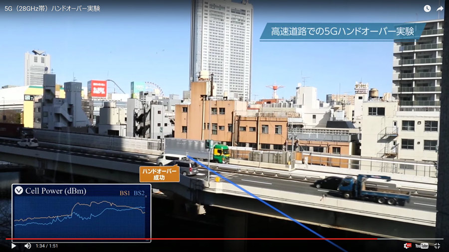 ただ、このビームフォーミングを使う際は、端末の位置を追いかけ次々と基地局を切り替えるハンドオーバーが難しいという問題があった。しかし、KDDIは、現在、衛星通信で使っている30GHz帯の技術を応用することで、これを克服。都市部の道路や高速道路といった、実際に使われる状況下で、ハンドオーバーの実証実験を行い、国内で初めて成功した。通信速度についても、今回の実験では、走行中の自動車で最大3.7Gbpsという実効スループットを達成しており、28GHz帯という高周波数帯を使った移動しながらの高速通信という、5Gに必要な条件をひとつクリアしたことになる。