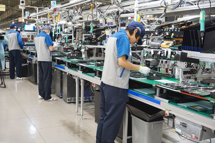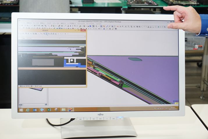 製品組立てラインを見ると、ノートPCの次にタブレットが、同じノートPCでもサイズが違うものが流れている。現在は90%が受注生産ということで、ひとつの生産ラインに複数の製品を流す混流生産ラインとなっているのだ。自動化にも積極的に取り組んでおり、プリント板製造は、部品実装、検査、加工、搬送、基板分割まで人の手を使わない「全自動一貫ライン」。製品組み立てラインと違い、こちらは混流というわけにはいかないので、装置やデータの切り替えが重要になってくるのだという。また、多品種少ロットを実現するために、研究開発部門と連携し、部品の共通化にも取り組んでいる。このような混流生産ラインや研究開発部門との連携により、顧客の多様なニーズに迅速かつ柔軟に対応できる体制を整えている。