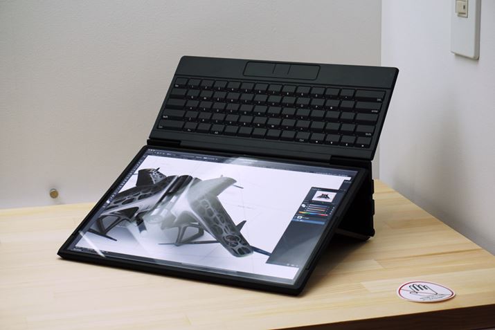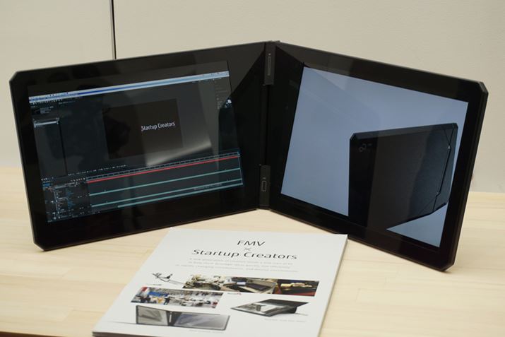 こちらもFMV×Startup Creatorsの1つ。折りたたみ式の2画面PCで、1つの画面でプレビューを見ながら、もう1つの画面で作業ができる