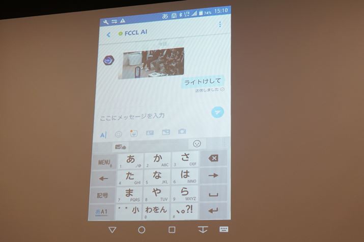 FCCL AIとは、Skypeを通じてテキストでやりとりできる。留守中の自宅の様子を写真で送ってもらったり、ライトを消したり、家電を操作したり、いろいろなことができる。電車移動が多い国内では音声よりもテキストでやりとりするほうが自然に使えそうだ