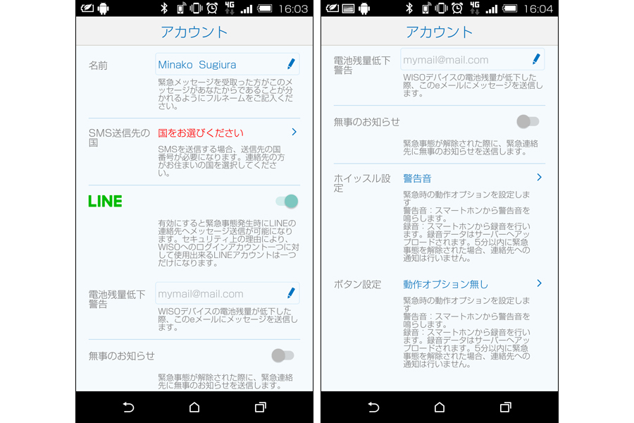 使う前の準備として、子ども(発信側)のスマートフォンに無料アプリ「WSIO」をインストールし、みまもりホイッスルと同期しておかねばなりません。スマートフォンのBluetoothをオンにして、「WSIO」を起動すれば自動で同期がスタート。表示される画面どおりに設定を進め、緊急時にSOSを送る相手のメールアドレスなどを登録します。緊急連絡先は最大7人まで登録可能。現在地を常時チェックするため、スマートフォンの位置情報サービスもオンにしておかなければなりません。なお、アプリの対応OSはAndroid4.4(KitKat/Lollipop)以上、iOS7.0以上となっています。