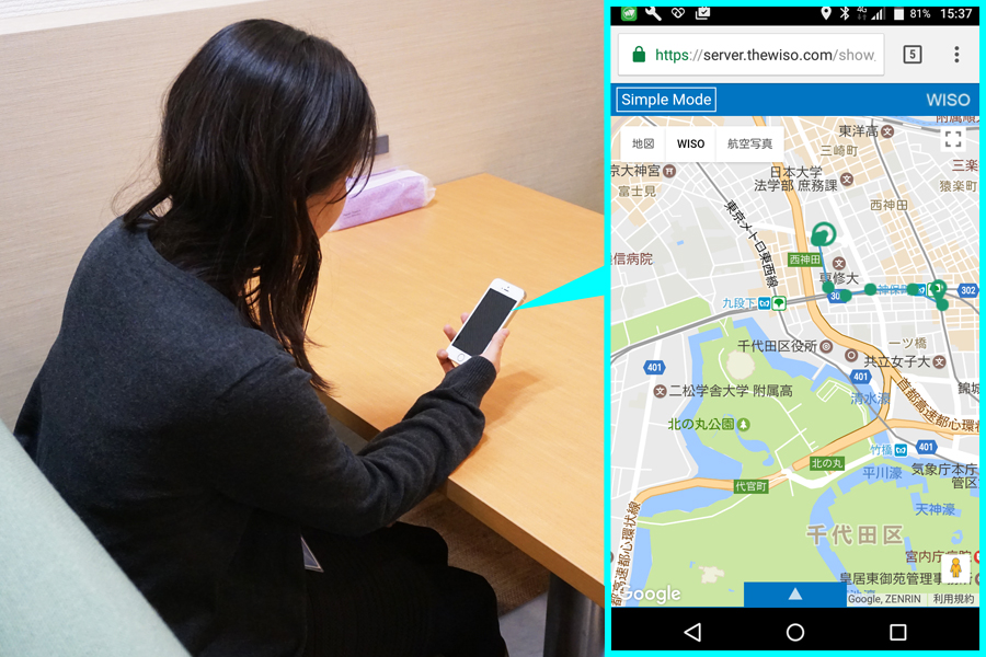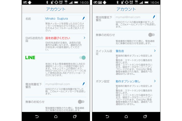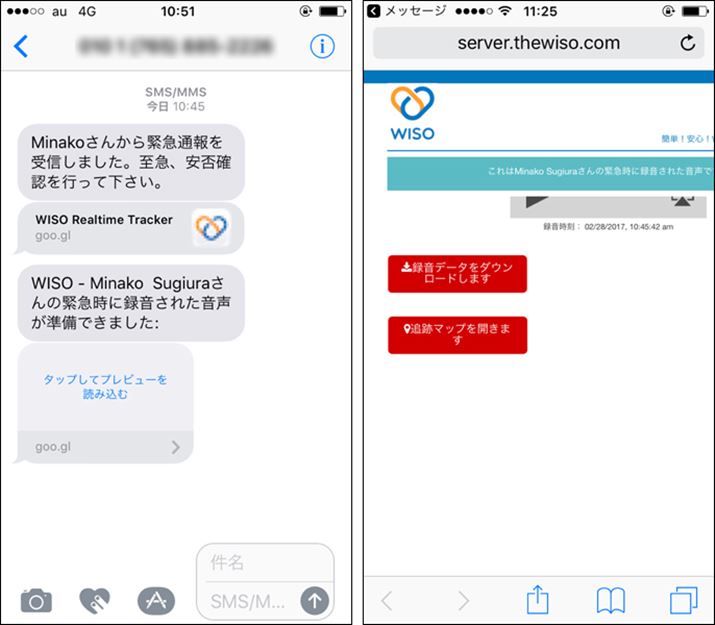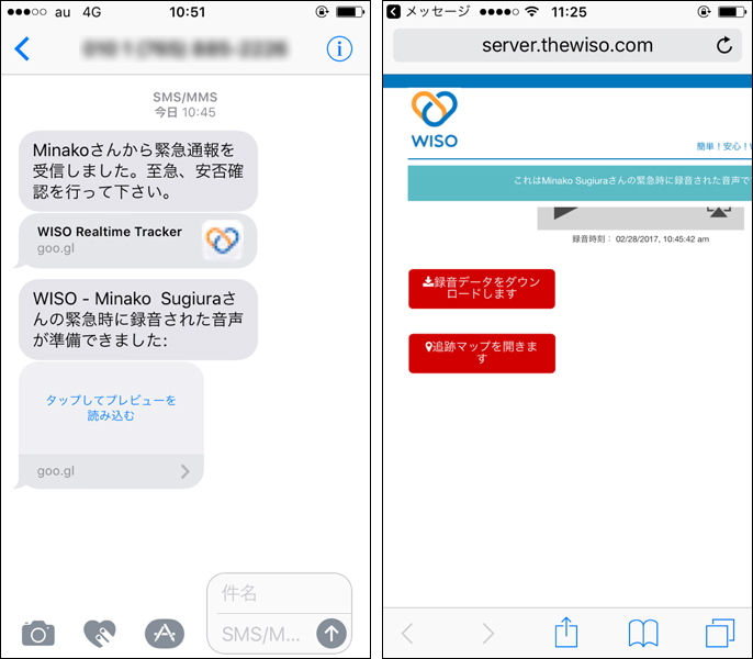 SMSとEメールを連絡先に設定しておいた受信側には、緊急通報の旨の通知が届きます。メッセージやメールには発信側の位置情報も送られてくるので、発信者の現在地をチェック可能。2〜3分ごとに位置情報が更新されるため、追跡もできます。さらに、設定画面で「録音」をオンしておいた場合、緊急発信から5分以上経過後に音声再生を知らせる連絡が送られてきます。なお、この位置情報のマップや音声データは「WSIO」のサーバー上に用意される仕様。