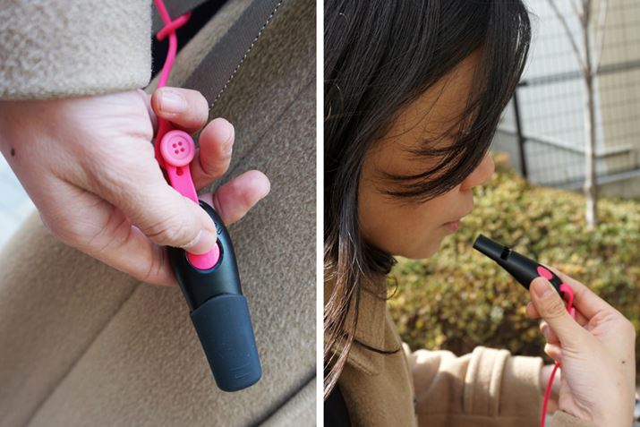 緊急の合図を送りたい時にはみまもりホイッスルのボタンを3秒以上押すか、キャップを外したところにある笛を吹きます