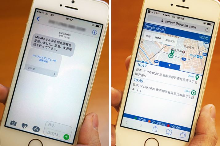メッセージは2通届きます。2通目をタップするとブラウザーが起動し、発信者がいる地点の住所と地図が表示