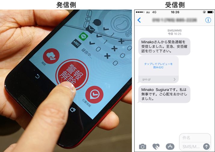 みまもりホイッスルで緊急発信を行うと、登録した連絡先に通知が送られます。たとえば、下の動画のようにみまもりホイッスルのボタンを押すと、発信側のスマートフォンのアプリが起動して一斉発信。電話番号の設定をしておいた受信者のスマートフォンには、発信から約15秒後に電話が鳴りました。なお、発信する際にスマートフォンが振動するのは、解除できないようです。スマートフォンはかばんの中に入れっぱなしでも作動させることはできますが、この振動で相手に気付かれたらどうしよう……という不安も。