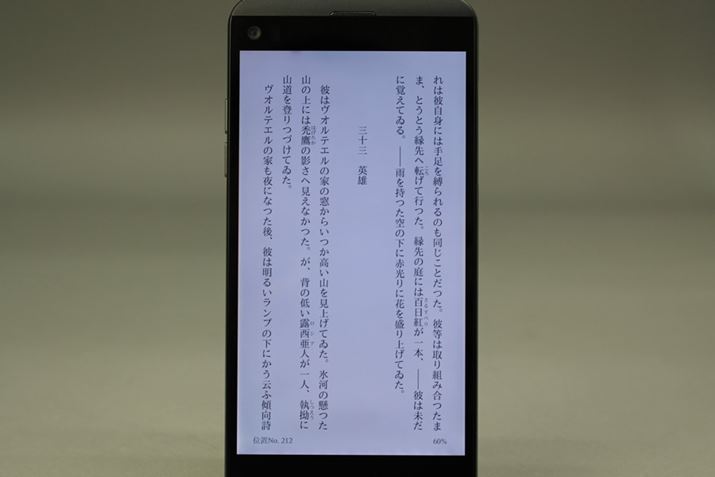 高精細ディスプレイでネックになりやすい輝度も十分。肉眼で見ると発色の偏りが少ないので、電子書籍の背景もきちんと白く見える