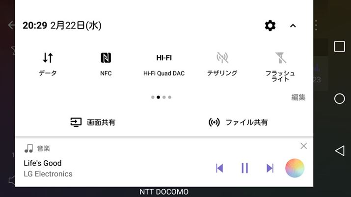 実際の音質だが、聴いてすぐに思うのは普通のスマホと違う、すっきりクリアなサウンドだ。これはやはりクアッドDACによるノイズ削減効果が効いている。ノイズが減ったことで、これまで埋もれていた音がハッキリ浮かび上がり、ハイレゾ音源対応のデジタルオーディオプレーヤーの入門機となら、十分渡り合えるレベルだ。なお、クアッドDACの動作切り替えは通知メニューにあるショートカットから簡単に行えるので、オン/オフの効果のほどがわかりやすい。