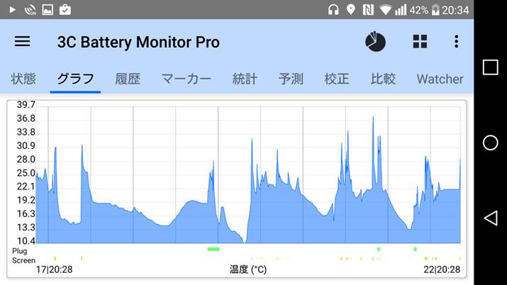 検証を行った5日間のバッテリー消費の様子。この間充電を行ったのは3回。途中急激にバッテリーを消費している部分があるが、そこは「ポケモンGO」を使った時間帯だ