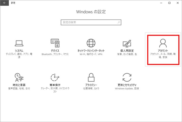 アクションセンターを開いて「すべての設定」をクリックするか、スタートメニューを開いて歯車型の「設定」ボタンをクリックする。「設定」が開いたら「アカウント」をクリックする