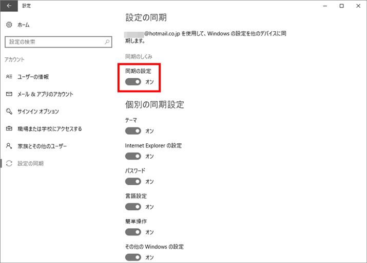 「設定の同期」が表示される。ここで「同期の設定」のスイッチをオン・オフすることで、同期する・しないをまとめて切り替えられる