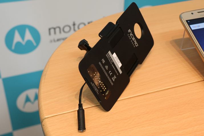同社のフラッグシップモデル「Moto Z」シリーズ用の新しい「Moto Mods」である「ビークル・ドック」。Moto Modsは、スマホにさまざまな機能を追加できる機能モジュール。ビークル・ドックは、車のエアコンの吹き出し口などにMoto Zを固定するためのモジュールだ。市場想定価格は9,800円(税別)で、春以降に発売する