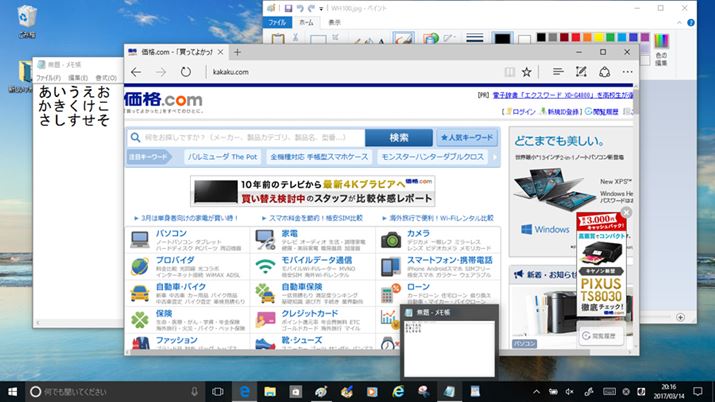 「メモ帳」や「ペイント」「エッジ」が起動している状態。「メモ帳」は一番後ろにあってアクティブになっていない状態だ