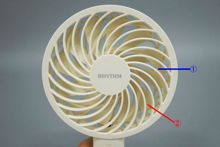 後側にあるファン(2)で空気を集めて、前側の細めのファン(1)で風をより集約して放出。この構造により、風がまっすぐ送られるそう