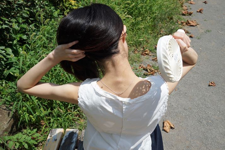 髪の毛が長いとうなじに汗がびっしょり。あおぐ必要がないので、うなじや背中にもぶつからず容易に送風できます
