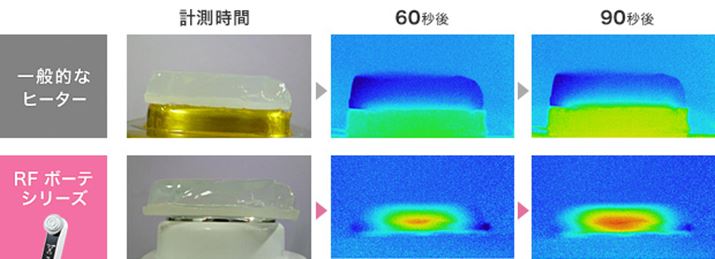 ヤーマン公式サイトにある「一般的なヒーターとRFの温まり方との比較」を説明する画像。一般的なヒーターは表面一部しか温まりませんが、RFは内部から全体が温められているのがわかります