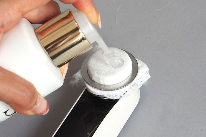 最初に試したのはクレンジングモード。このモードは、通常の化粧を落とした洗顔後に行います。使用前の準備は、化粧水かジェルで濡らしたコットンを本体に挟むだけ。使用する化粧水(あるいはジェル)はトロミがあるほうがRFの温感を感じやすいそうですが、「水溶性」のものであれば基本的にはどの製品でもOKだそう。筆者は化粧品によっては肌がかゆくなる敏感肌のため、自分が普段使用している化粧水が使えるのはかなりうれしいポイントでした。