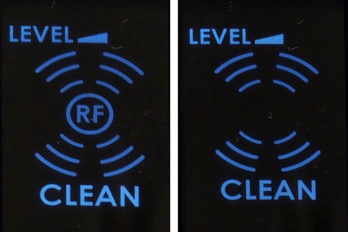 RFとクレンジングが約15秒ごとに切り替わります。現在がどのモードかは「ピッ」という音のほか、液晶画面の「RF」アイコンの有無で視認可能