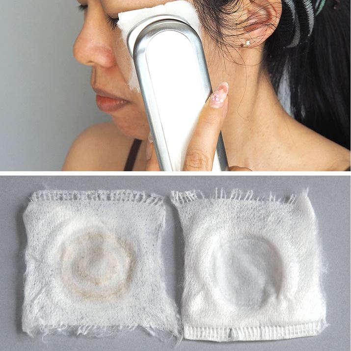 肌の上を滑らせるようにHRF-1を動かします。コットンが乾きそうなら化粧水を追加すればOK。顔の左側はHRF-1のクレンジングモード、右はHRF-1のスイッチを切った状態で使ってみました。クレンジングモード使用のコットン(写真左)だけ汚れが付いています