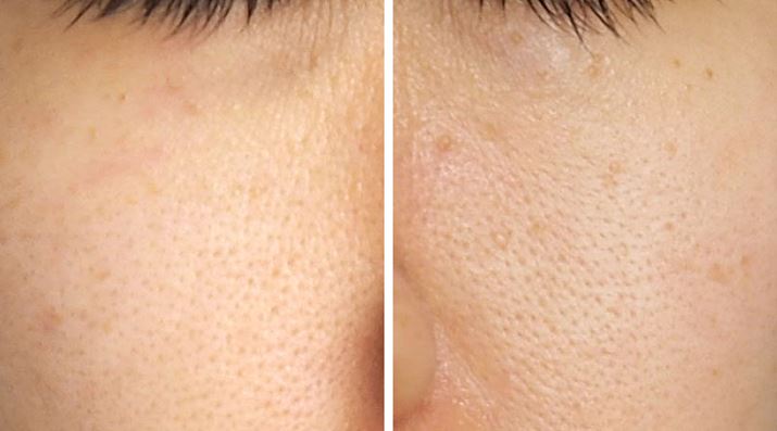 顔左側だけモイスチャーモードも実行(写真左)、コットンで化粧水をパッティングしただけの肌(写真右)より、毛穴が小さくなっているように見えます