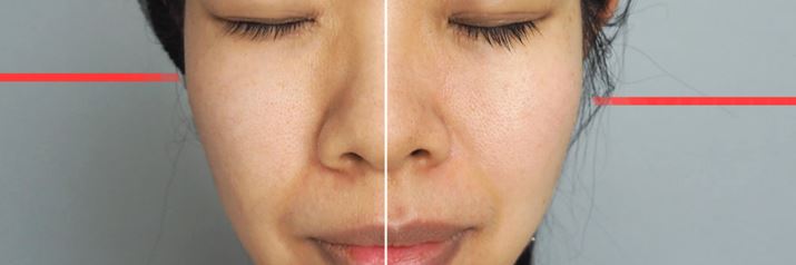 顔左側のみEMSを使用。EMSを使用したほうが、左がやや上がっているのがわかります(左右頬のトップ位置に引いた赤線に注目)。また、ほうれい線も左のほうが目立たなくなっていると思います