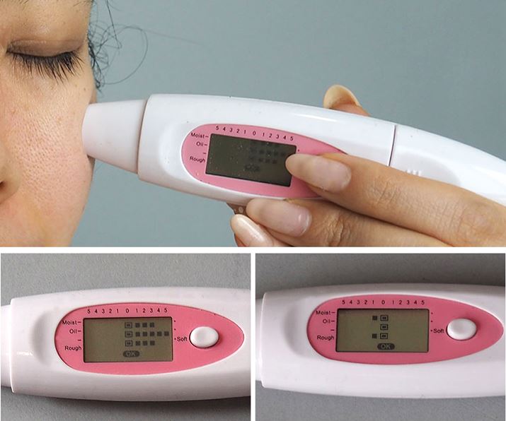 顔の左半分にクレンジング、モイスチャー、EMS、クールモードをひととおり行い、右半分は、左と同じ工程をスイッチオフの状態で行ったもの。簡易的に肌チェックをしてみたところ、5分後は両面とも保湿力、油分、肌の柔らかさすべてが+3以上と優秀な数値。しかし、15分後に再計測すると、HRF-1でケアした左はほぼ同じ数値だったのに対し、使用していないほうは全数値がマイナスに