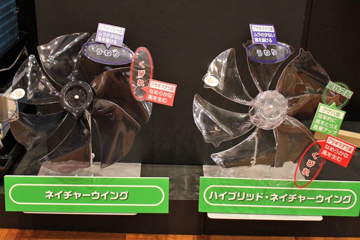 最上位モデル「PJ-G2DBG」の羽根「ハイブリッド・ネイチャーウイング」は、「ネイチャーウイング」のアホウドリの翼の特性にくわえ、アマツバメの翼形状を付け根部と先端部に施すことで風量をアップ