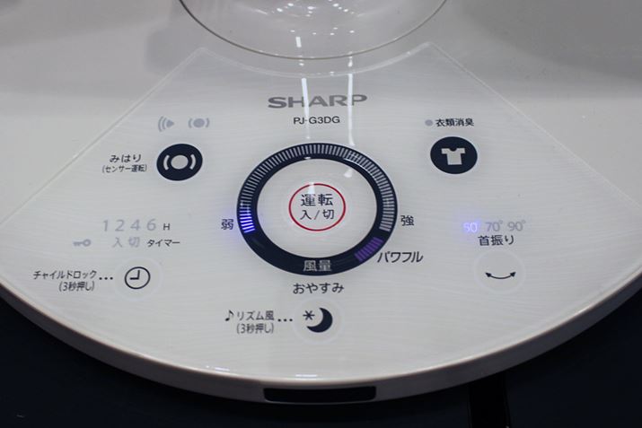 DCモーター搭載機の首振り(自動)は、左右約90°/70°/50°で設定可能(ACモーター機は約75°)。上位モデル「PJ-G3DG」には、3Dファンの最上位機同様に「みはり」機能が搭載されています
