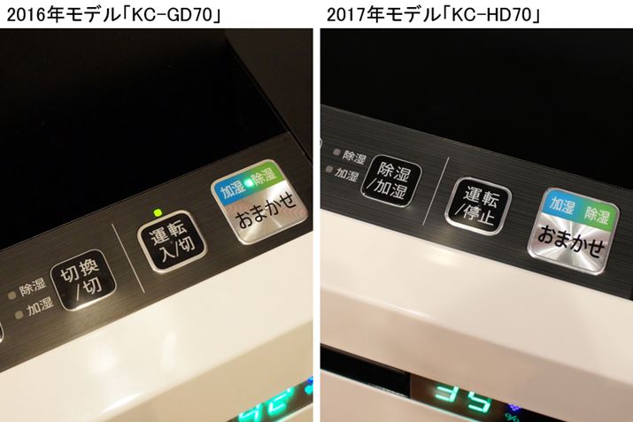 空気清浄機に加湿機能と除湿機能を搭載した除加湿空気清浄機「KC-HD70」は、ホコリ、ニオイ、湿度、温度、照度の5つをセンサーで検知し、最適な運転を行う「おまかせ」モードの精度が改良されました。前モデルの利用者に調査した結果、夏場にエアコンを控えめで使っている際、湿度が上がると自動で除湿運転が始まってしまう反応をもう少し抑えてほしいという声が集まったことから、実環境で“本当に快適”と感じられるようにモードの切り替えの条件を見直したそう。また、操作部の表示もよりわかりやすく変更されました。なお、除湿はコンプレッサー方式、加湿は気化式となっています。