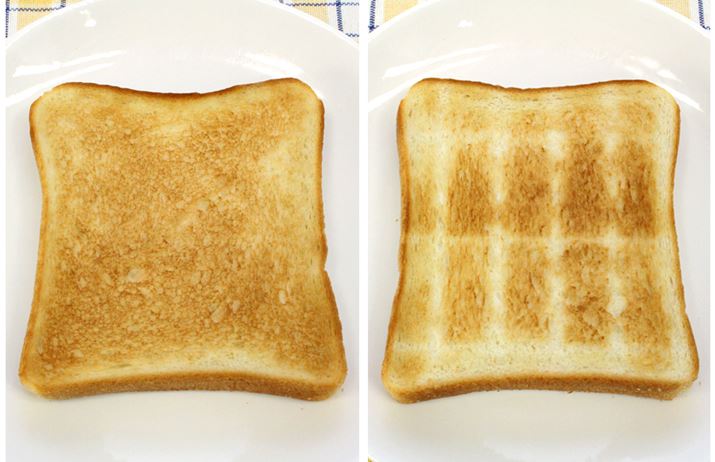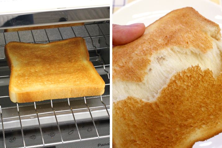 できあがったトーストは、表(左)も裏(右)もムラなく美しいキツネ色の仕上がり。ちなみに、オートでの焼き加減は5段階から選べます