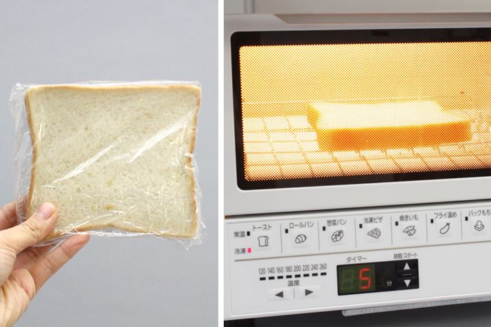 冷凍した食パンも同じくオートでトーストしてみました。「トースト」ボタンを2回押すと、冷凍パンモードになります。こちらの焼き時間は5分