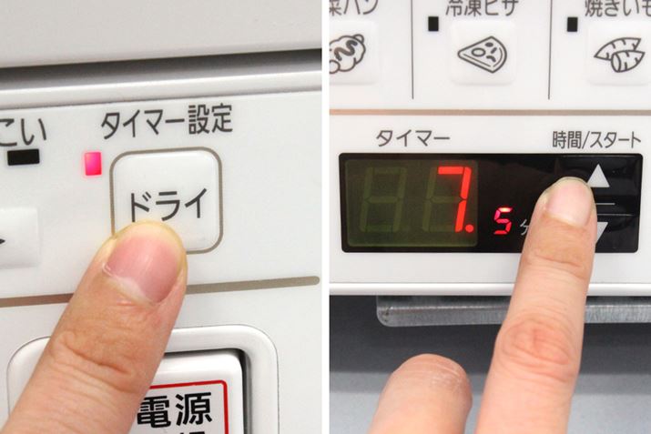 本記事の検証のため、あえて“ふにょふにょ〜”に湿気らせたポテチをNB-DT51にセット。「ドライ」ボタンを押したら、30秒ステップで調整できるタイマーでドライ時間を設定します。ポテチや薄めのおせんべいなら10分前後、厚めのおせんべいなら15分前後がタイマー目安のよう