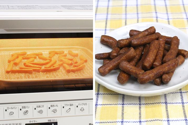 湿気ったおせんべいや、かりんとうも「ドライ」機能でパリパリに復活! かりんとうは、ドライしたては熱くてやわらかいのですが、少し冷ますとサクッとおいしくなります。なお「ドライ」機能を使うときは、お菓子が重ならないようにトレイに並べるのがコツ。