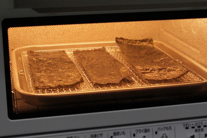 湿気りやすくて困るものの代表選手といえば「海苔」。これをNB-DT51でドライしたらどうなるのでしょうか? 焼けてしまうのではないかと不安でしたが、ものは試しとやってみたら、なんと1分前後の加熱でまったく焦げずにパリパリに。NB-DT51の能力高さを実感しました。そのほか、おせんべい、かりんとうなどのお菓子もイイ具合にサクサク復活します。