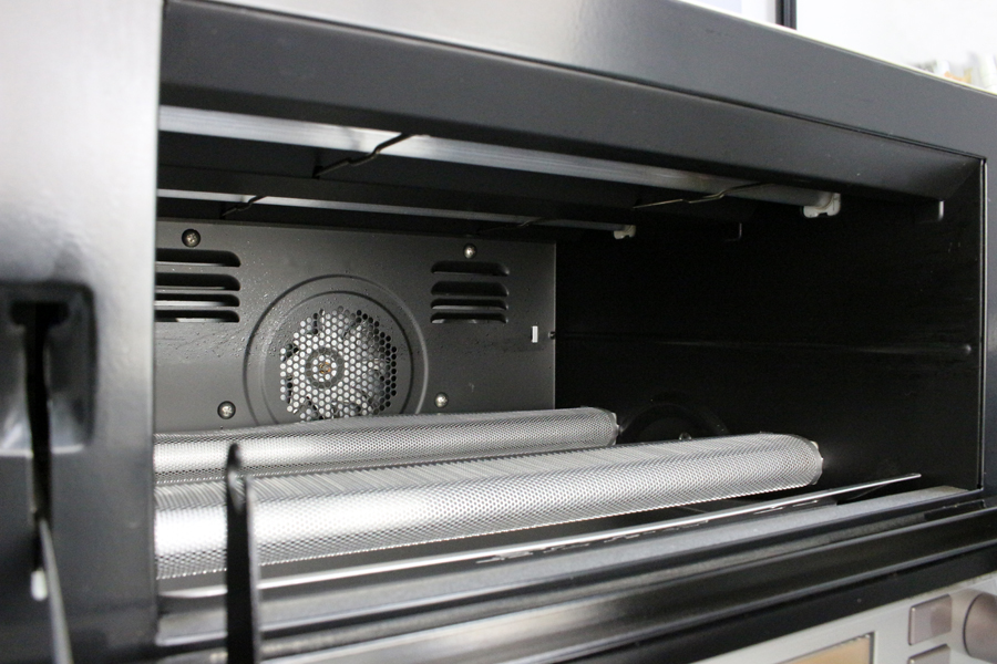 スモークトースターは、上下に2本ずつヒーターを搭載。下ヒーターは網目のパーツの中に、上ヒーターと同じものが入っています。コンベクション調理の際には、上下ヒーターで熱した空気を庫内奥にあるファンで対流させて加熱