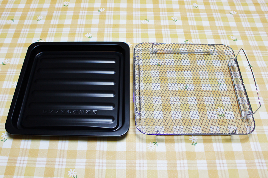 焼き網に食材を並べ、角皿の上に置きます。チーズのようなとろける可能性のあるものは、アルミホイルを敷くほうがいいそう