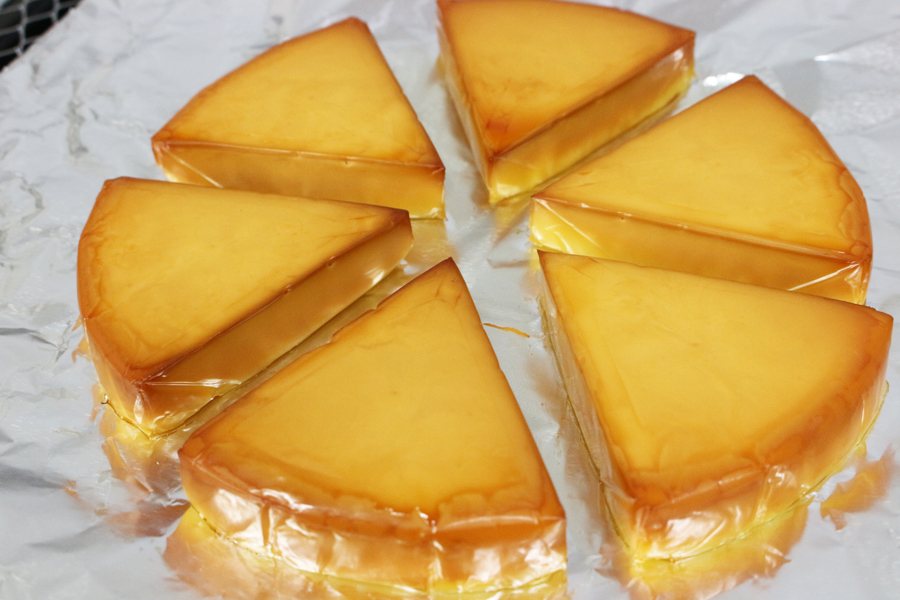 ちなみに、けむらん亭で作ったチーズの燻製のほうが飴色は濃いですが、少しチーズの縁が溶けました(スモークチップ15g、加熱時間13分)。スモークトースターよりもけむらん亭のほうが庫内温度が高いのかもしれません