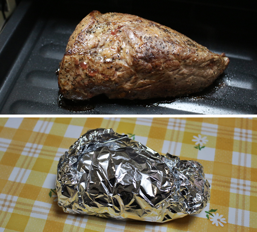約17分のコンベクション調理(約250℃)で加熱完了。あまり変化がないように見えた牛肉ですが、ほんのり表面が焼けたような気がします。その後、オーブンから取り出し、アルミホイルで包んで30分放置
