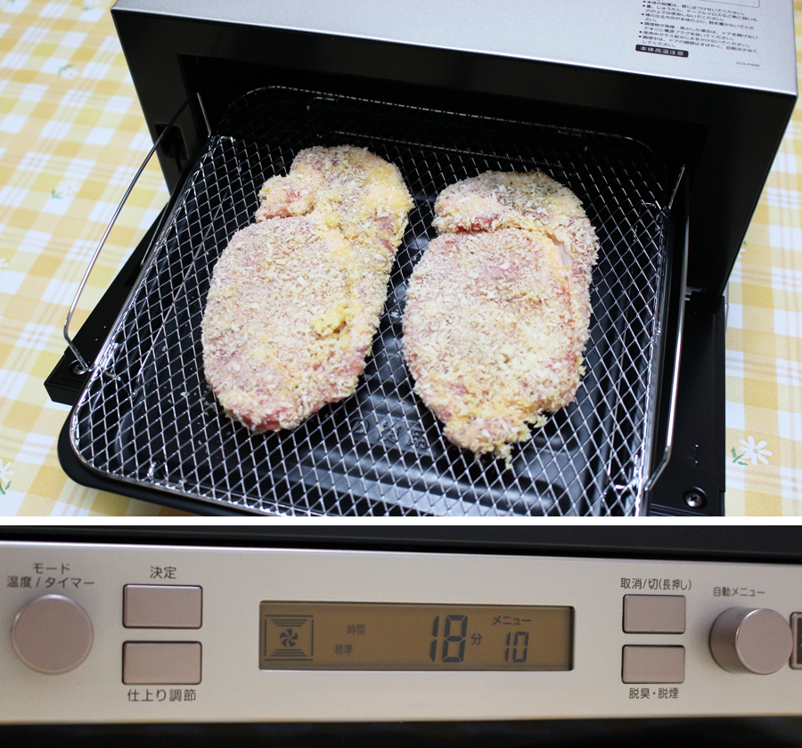パン粉をつけた豚ロース肉をセットし、自動メニュー「とんかつ」で加熱します
