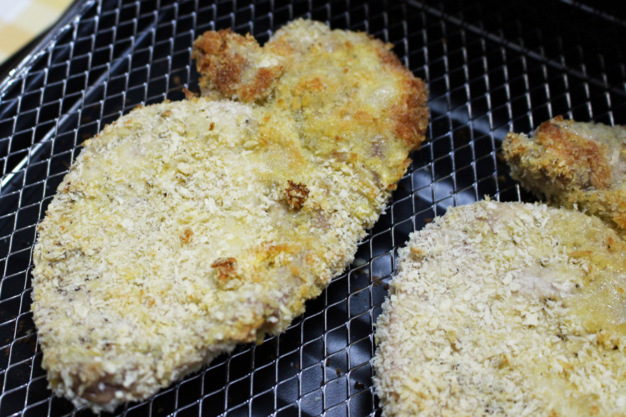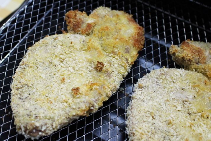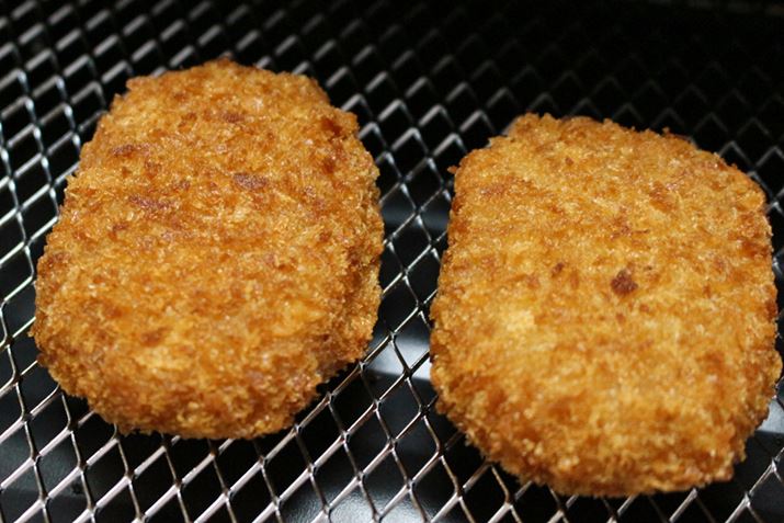 約18分後、調理は完了しましたが、衣の色は白いまま。付属のレシピブックによると色づきをよくしたい場合には、衣に少量の油を塗ってから加熱するとアドバイスがありました。たしかに、脂身の多い部分はキツネ色になっているので、見た目を重視するなら事前にパン粉に油をスプレーするなどしておきましょう