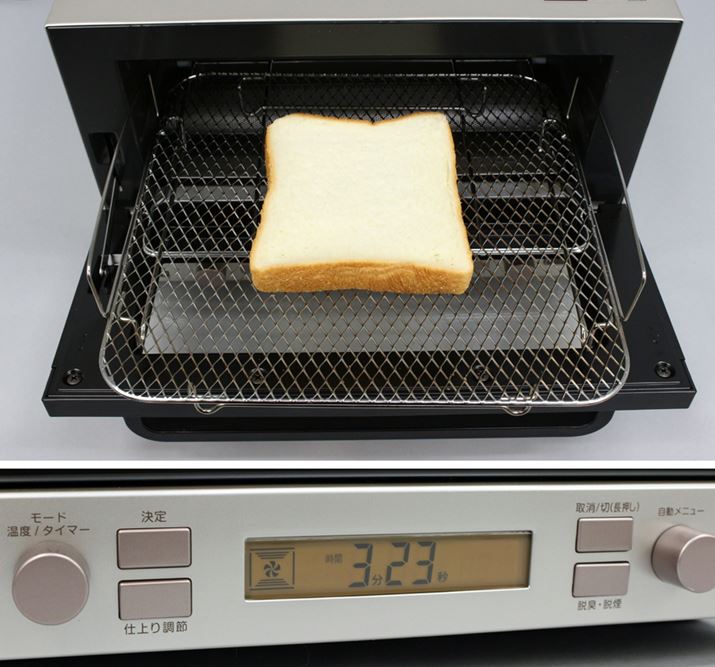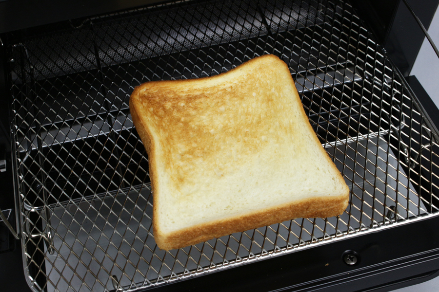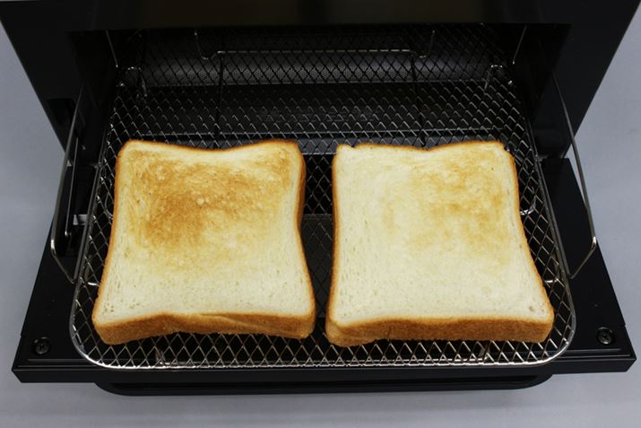 ただ、自動メニューの中には、ちょっと焼きが甘いと感じるものもありました。焦げてしまうよりも対応しやすいですし、手動で加熱を追加することも簡単なのでそれほど問題ではありませんが、「トースト」は指定どおりのやり方では理想的な焼き加減にはならず(手前側と奥で焼き色にムラあり。下の写真参照)。自動メニューの「トースト」では2枚焼きか4枚焼きしかできないのも、残念なポイントです。しかし、搭載されている機能、性能と価格を考えるとお買い得だと思います。