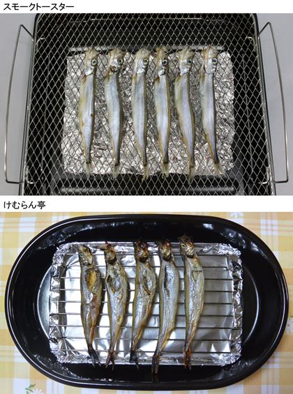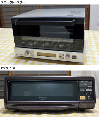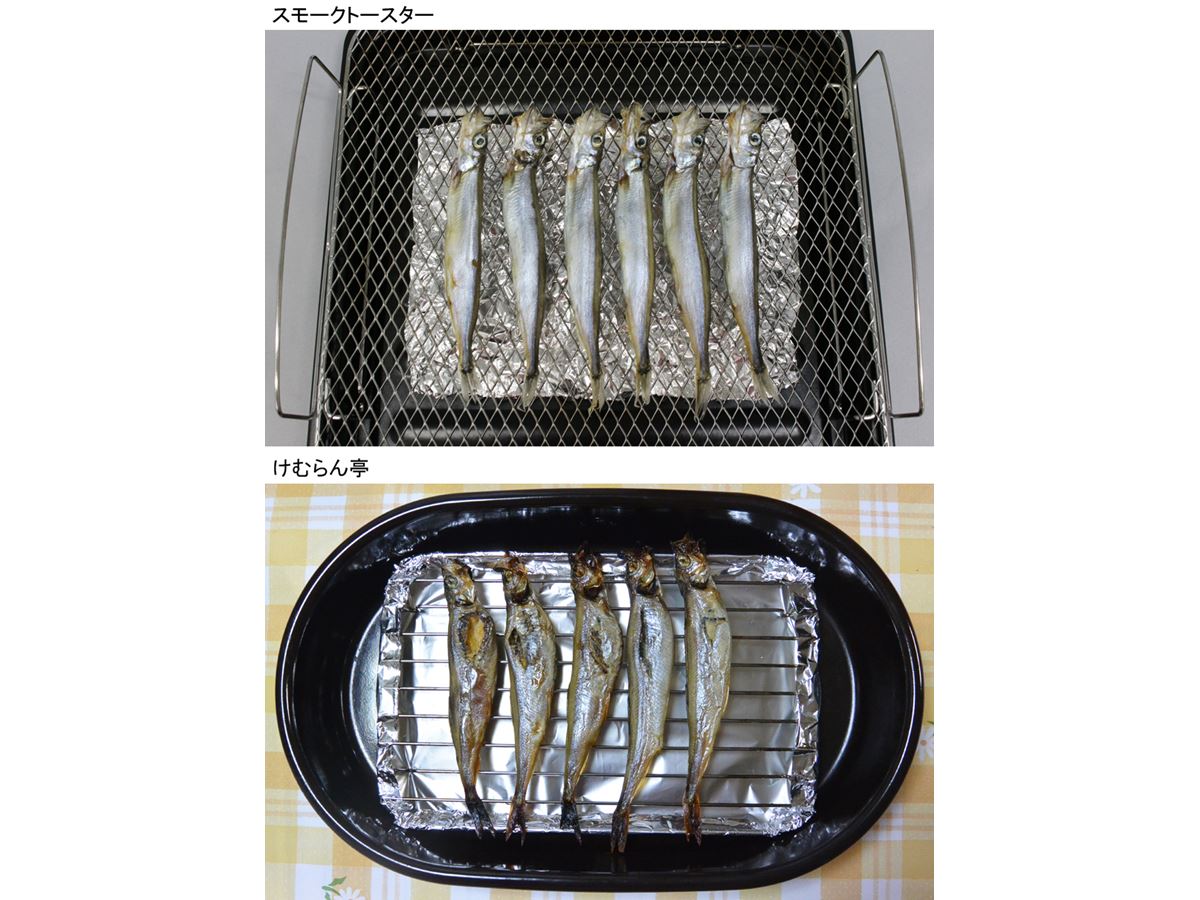 魚をカットせずに入れられる450(幅)×185(高さ)×355(奥行)mmのけむらん亭に対し、スモークトースターは一般的なオーブントースターに近い形状をした360(幅)×235(高さ)×435(奥行)mm