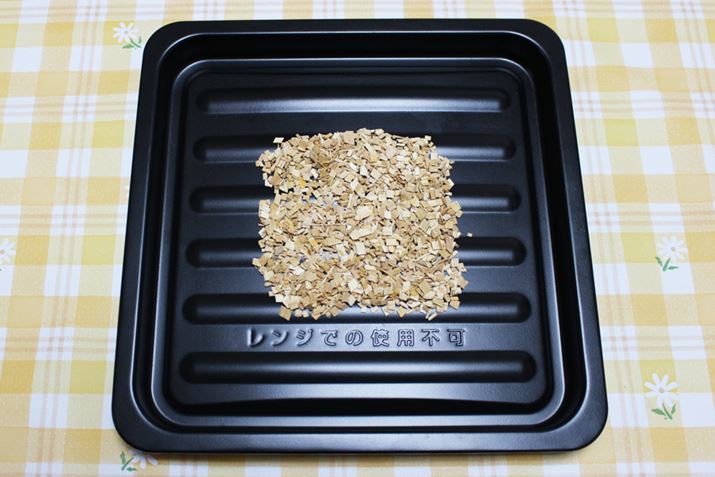 角皿の中央に13×13cm程度にスモークチップ(15g)を置きます。最初は定規を使ってサイズを測っていましたが、慣れれば角皿にある凹凸を目安に判断できるようになるのでさほどめんどうさは感じません