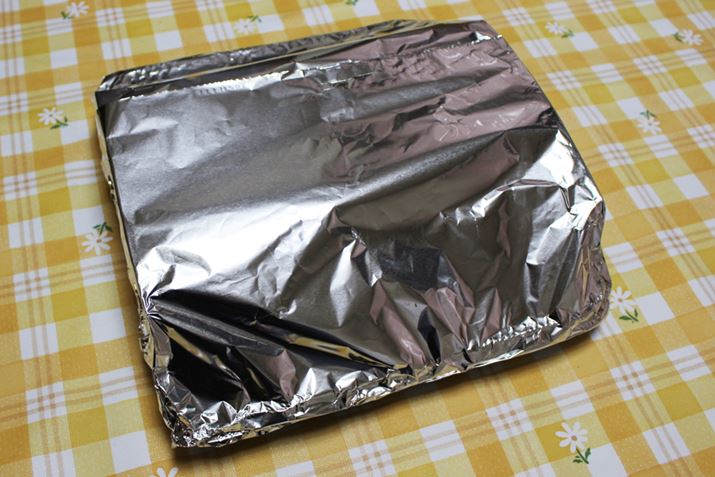 全体をアルミホイルで覆い、煙が漏れないようにします。一応、取扱説明書にアルミホイルのサイズは25×45cmを2枚とあり、指定されたサイズにアルミホイルをカットする準備が少々大変でした