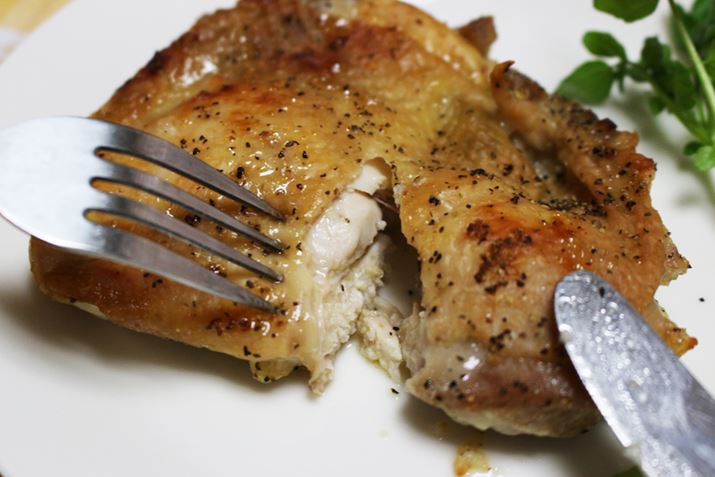 鶏の皮は見るからにおいしそうな焼き色が付き、パリッとしています。ナイフを入れると、中から肉汁があふれてきました