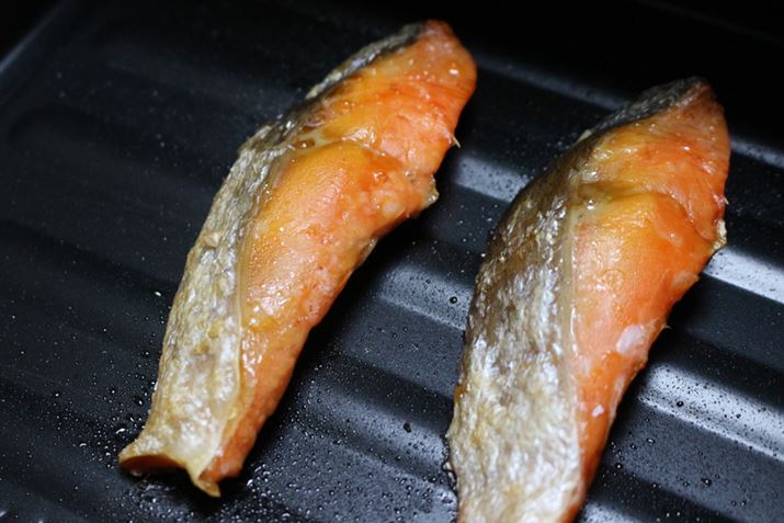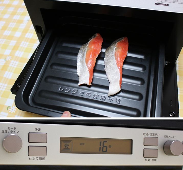 ここまで自動メニューでいろいろな調理を試してきましたが、今度は手動でも料理を作ってみましょう。手動といっても、調理モードを選び、コンベクション調理とオーブン調理の場合は温度を100〜250℃で設定し、最後に加熱時間を決めて「スタート」ボタンを押せばいいだけなので、それほど手間ではありません。今回、手動調理で焼いてみたのは塩鮭。スモークトースターに搭載されている魚類の自動メニューは「塩さば焼き」と「ぶりの照焼き」しかなかったので、鮭の切り身は手動での操作となります。